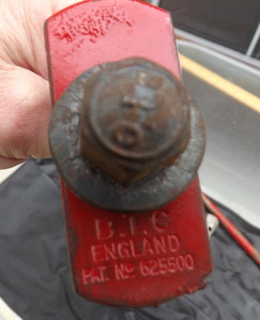 Description This BTC A frame jack looks similar the previous entry except for the inverted 'U' lifting arm. The jack is 17.875" tall to the top of the hexagon nut and 6.875" wide at the base. The hexagon nut is 0.68" (11/16") across the flats. The inverted 'U' lifting arm is 4.375" long and 0.812" (13/16") wide. The stamping on the base reads B.T.C ENGLAND PAT No 625500. Applicable Vehicles: Not known. Jack Handle Type: Starter handle as above or a separate wheel nut wrench. Year Dates Noted: Circa 1958. Value: