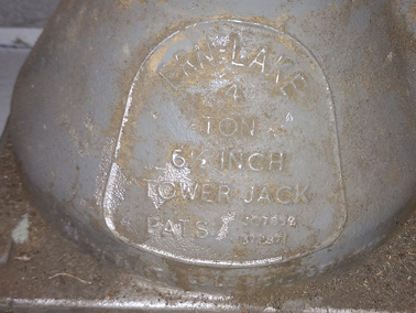 Ern Lake Tower Jack Description The jack is a 4 Ton 6.5" triple screw jack. It is cast ERN LAKE 4 TON 6 1/2 INCH TOWER JACK PATS 197859 872871. Other side cast: 5120-99-201 4908 1985. The base is stamped 85/55157. If the 1985 is a date I am a little surprised. I was not aware of this jack being produced long after WW2. Any information welcome. See also Harvey Frost Type 92 and Epco Tower jacks Applicable Vehicles: Not known but possibly the same as the SIF variant below. Jack Handle Type: As shown in photos. Year Dates Noted: