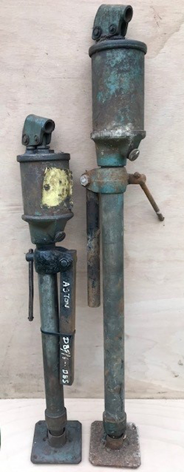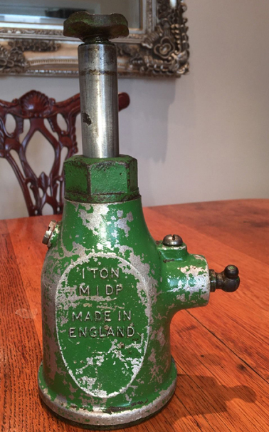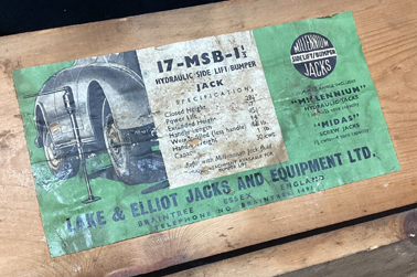 Lake & Elliot Millennium 17-MSB-1 1/2 Description The Millennium 17-MSB-1 1/2 is identical to the jack above except for the following changes: Closed height is 28.5" Lift is 17" giving an extended height of 45.5". The leg diameter is 1.4". Total weight is 17 lb. Lifting capacity 1.5 tons. Oil capacity is 1/2 pint. The 2nd and 3rd photos, courtesy of Gary Skinner, shows both the 12 and 17 versions side by side. Apart from the different height the 17 version has a larger/taller reservoir and a greater diameter leg. The 4th to 7th photos show a boxed version. It sold for £1,650.00 in September 2023. Applicable Vehicles: Not known. Jack Handle Type: As shown, 14" long. Year Dates Noted: