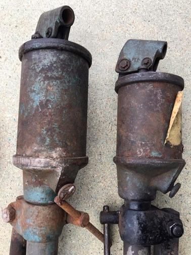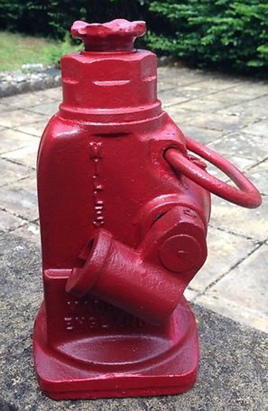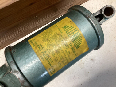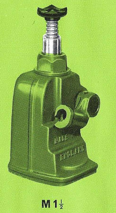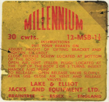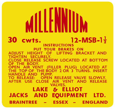 Lake & Elliot Millennium 12-MSB-1 1/2 Description The jack is a Millennium 12-MSB-1 1/2 with a 30cwt lifting capacity. It is 22.5" high when closed. It has a lift of 12" giving an extended height of 34.5". The base is 3.5" square, but a 6" square base was available from L&E as an optional extra. The leg diameter is 1.25". The jack weighs 13lbs. Oil capacity is 1/3 pint. A slightly larger version of the jack was also available, known as the Millennium 17-MSB-1 1/2. See next entry. Photos and information courtesy of Mark Seligman. The labels in the 3rd and 4th photos show the original and a reproduction. The final 2 photos, courtesy of Gary Skinner, shows both the 12 and 17 versions side by side. Apart from the different height the 17 version has a larger/taller reservoir and a greater diameter leg. Applicable Vehicles: 12-MSB-1 1/2: Aston Martin DB5, DB6 and DBS Jack Handle Type: As shown in the last 2 photos , 14" long. Year Dates Noted: