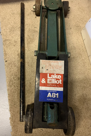 Lake & Elliot A1.5 Trolley Jack Description The A1.5 trolley jack has a 30 cwt lift capacity. Closed height is 4.5". Extended height is 19.25". Overall length is 32.25" and width is 13.25". The detachable handle is 40.5". Note: A Lake & Elliot pamphlet referred to this jack as the A1 1/2". Applicable Vehicles: Garage jack. Jack Handle Type: Detachable, 40.5". Year Dates Noted: