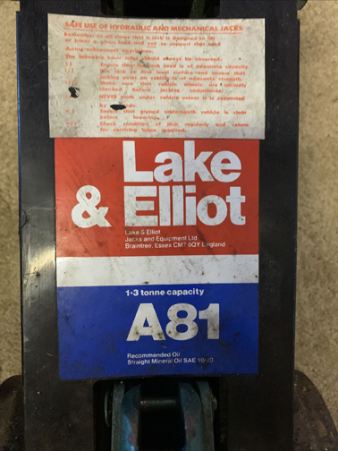 Lake & Elliot A81 Trolley Jack Description The jack label says Lake & Elliot A81 1 - 3 Tonne capacity. Other details as shown in the photo. Applicable Vehicles: Garage jack Jack Handle Type: As shown. Year Dates Noted: