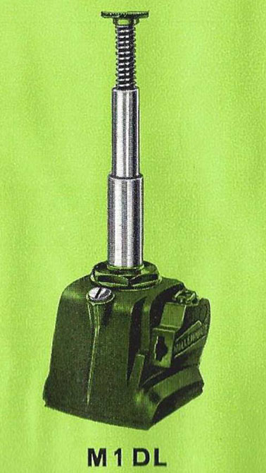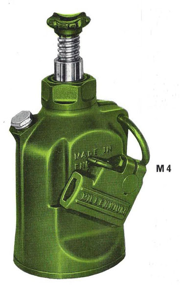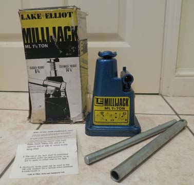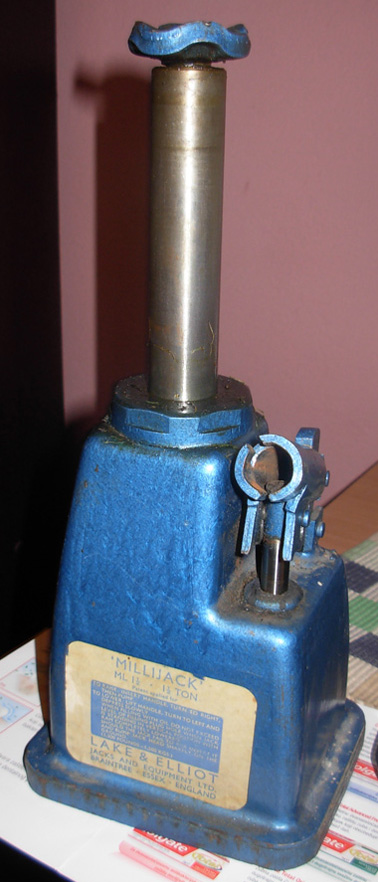 Lake & Elliot Millijack ML1.5 Description 1.5 ton jack. Single ram hydraulic jack with a single manual screw extension. It measures 6.75" closed with a 4.5" lift and a 3" screw extension. Photos of blue jack courtesy of Dalibor from Serbia. Applicable Vehicles: Not Known Jack Handle Type: Two tubular bars as shown in final photo Year Dates Noted: