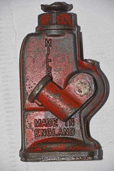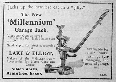 Lake & Elliot Millennium Garage Jack Description An early garage jack from 1909. Cast MILLENNIUM GARAGE JACK and PATENT No.2271406 on the heel. Interesting ratchet mechanism to lift the entire body up the central pedestal. Similar to the jack below except it has only one lifting saddle. The final photo is from Graces Guide with a published date of 1909. It or the Dunlop Type 7 features at Brooklands in the 1920s on an MG K3 wheel change. Applicable Vehicles: Garage jack Jack Handle Type: Integrated Year Dates Noted: 1909 Value: Average price paid in 2019 = £9.50 - 1 sale Average price paid in 2020 = £20.00 - 1 sale Average price paid in 2024 = £20.00 - 1 sale