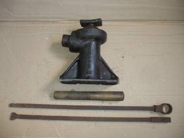 Description: This 3-stage jack is very similar to the LJ31 below and may have been used on some of the same vehicles. TI have refered to it as A212 although this is likely a batch number rather than model number. It is cast SHELLEY down the barrel and A212 in the gusset. In the other gusset it has a vertical arrow above the number 50. The base measures 5.5" by 3.5" and is 5.75" closed height. Photos and data courtesy of Geoff Mackenzie. I have been advised by Ian Jolly that the arrow has been used to indicate Crown Property since the 1550s. It is likely that this jack was used by GPO vehicles who also used this symbol. The LJ31 below was known to be used by GPO vehicles and also carries this symbol. Applicable Vehicles: GPO vehicles Jack Handle Type: Probably two section with a wooden handle. Year Dates Noted: 1949, 1950 Value: Average price paid in 2017 = £9.99 - 1 sale