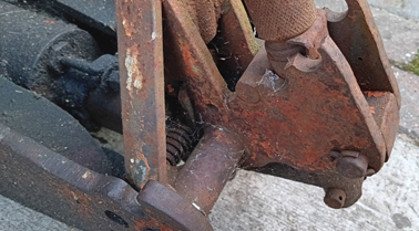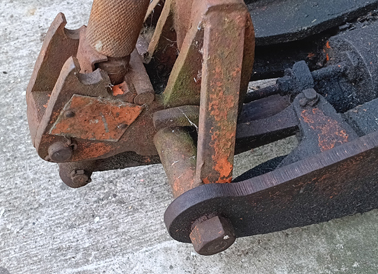 Description: This 5 ton jack has a number of similarities to the one above. Main differences are the shorter reach jack arm; and the lever arrangement behind the handle shaft. Unfortunately the label is damaged where the model number should be displayed. Interesting to note that the label states "A DIVISION OF FKI BRADBURY.....". Total Length 147cm; Main Body Length 126cm; Body Width 16.5cm; Body Height 18cm; Max Width inc Wheels 43cm; Lift Arm Length 54cm; Lifting Max Height 60cm; Hand Lever Length 118cm. Applicable Vehicles: Garage trolley jack. Jack Handle Type: Integrated. Year Dates Noted: