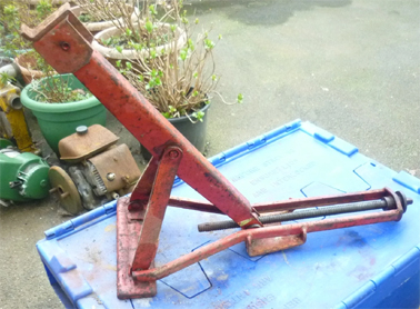 Metallifacture Central Foot Cantilever - Austin/Morris? Description Very rare cantilever jack with the central foot and attached handle that I have only previously seen for the early E-Type Jaguar (first entry above). However, this version is in original red paint typical of Austin/Morris of the period and has the Mini style jacking point. This type of jack was superceded in 1967 with a detachable handled version. The traditional Mini cantilever jack did not have the mid point foot. See Mini below. Any information on vehicle type most welcome.